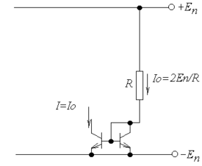 десь использованы два одинаковых транзистора (лучше изготовленных в одном цикле), и через правый, включённый по схеме диода (коллекторный р-п переход закорочен, и остаётся только эмиттерный р-п переход) пропускается прямой ток. Этот ток определяется формулой:
