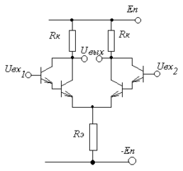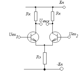 а рис. представлена схема, состоящая из двух по возможности одинаковых транзисторов, двух коллекторных резисторов, тоже одинаковых, и одного эмиттерного резистора, общего для двух транзисторов. Схема имеет два входа и один разностный выход. Здесь также обычно используется два источника питания.