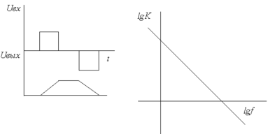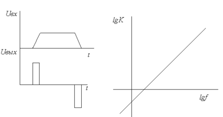 На левом рисунке представлены зависимости от времени входного и выходного сигнала. На правом рис. частотная зависимость для дифференцирующего усилителя.