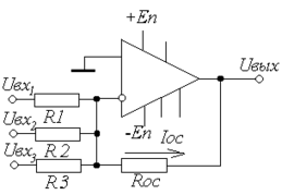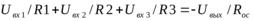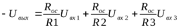 десь входные токи равны входным напряжениям, делённым на входные сопротивления. Далее эти токи суммируются и приравниваются к выходному току, равному отношению выходного напряжения к сопротивлению обратной связи: