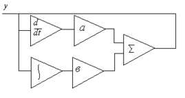 нтегрирующий усилитель, два простых усилителя с точно заданными коэффициентами усиления для моделирования умножения на постоянные коэффициенты, один сумматор. Схема такой АЭВМ представлена ниже: