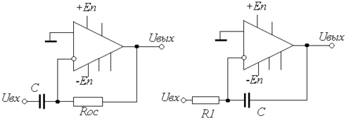 Есть ещё две интересные схемы с конденсатором вместо входного сопротивления или конденсатором в цепи обратной связи: