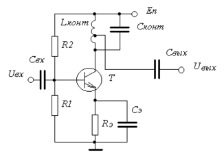 Здесь Свх и Свых – обычные разделительные конденсаторы, R1 и R2 – резисторы базовой цепи, Rэ и Сэ – элементы обратной связи по постоянному току (для термостабилизации) и Lконт и Сконт – элементы резонансного контура.