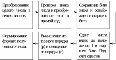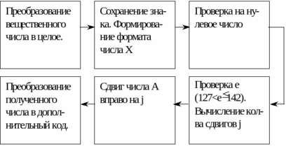 Поскольку мантисса результата формируется путем сдвига исходного числа влево, то регистры R2, R3 используем для размещения мантиссы результатов.