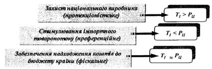 | Протекціоністське | Призначене для захисту національного виробника від іноземної конкуренції | Максимальні | Припинення ввезення іноземних товарів |