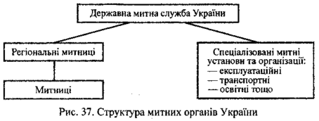 Безпосереднє здійснення митної справи покладається на митні органи України, до яких належать Державна митна служба України (далі — Держмитслужба) як центральний орган виконавчої влади, регіональні митниці, митниці (рис. 37). Крім митних органів до складу митної служби України входять спеціалізовані митні установи та організації (експлуатаційні, транспортні, інформаційно-аналітичні, освітні тощо), які створюються для виконання завдань, покладених на митні органи. Для боротьби з контрабандою, особливо з контрабандою наркотиків, підакцизних і високоліквідних товарів, зброї, вибухівки, культурних та історичних цінностей, іншими товарами і транспортними засобами під час їх переміщення митною територією України у зонах діяльності регіональних митниць утворюються підрозділи з боротьби з контрабандою і порушеннями митних правил, які підпорядковуються безпосередньо Держмитслужбі.