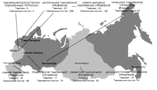 Таможенные органы РФ - это государственные органы, которые непосредственно осуществляют деятельность в сфере таможенного дела. Таможенные органы являются органами исполнительной власти. Исполнительная деятельность таможенных органов состоит в повседневной практической организации решений вопросов, связанных с таможенным делом. Схема размещения таможенных органов на территории России приведена на рисунке 1.
