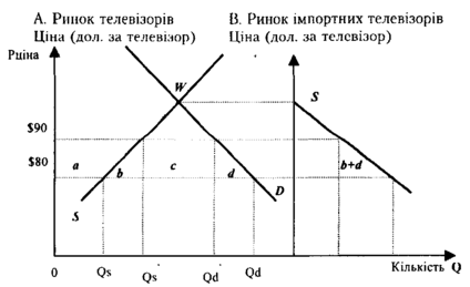 Чисті національні втрати від введення національного тарифу. Збитки, які завдаються державі, можна визначити й в інший спосіб. Права частина рис. відображає ринок імпортних телевізорів. Крива попиту на цьому ринку показує, на яку величину попит перевищує пропозицію за кожного рівня цін.