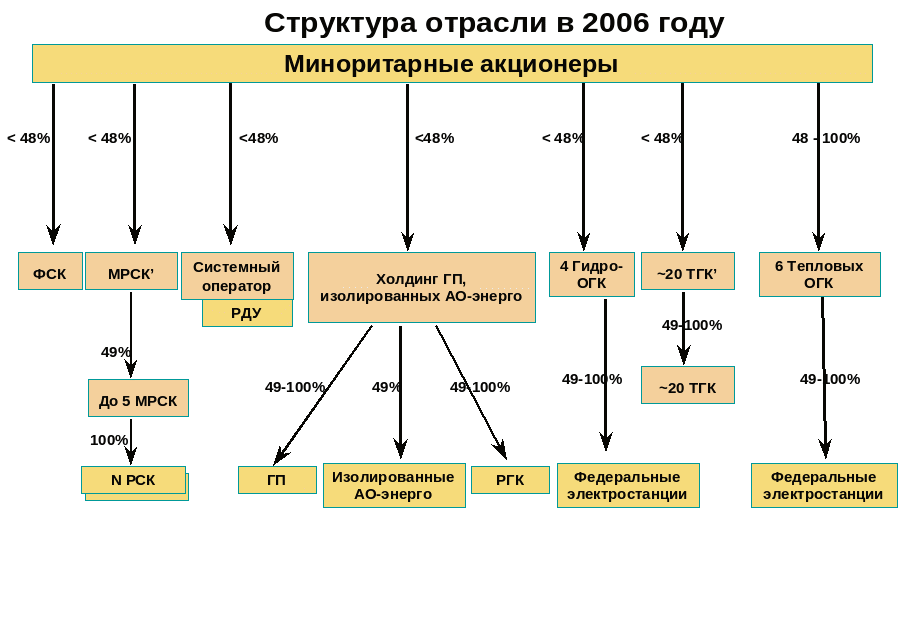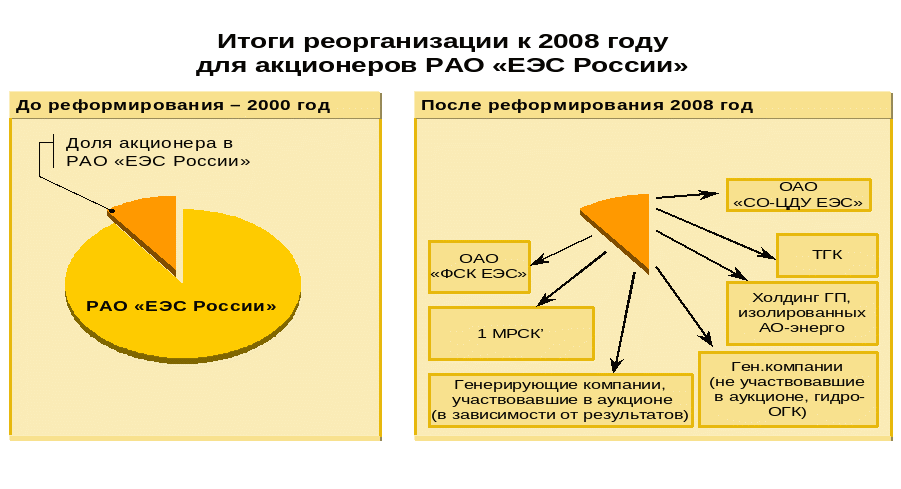 Таким образом, после окончания всех основных процедур реформирования холдинга к 2008 году каждый акционер РАО «ЕЭС России», владевший до начала реорганизационных процедур пакетом акций, при условии, что он не будет приобретать дополнительные либо продавать имеющиеся у него акции, будет владельцем пакетов акций следующих субъектов отрасли: