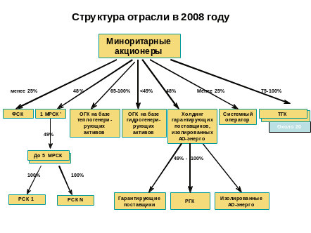 Предполагается, что к 2008 году будут завершены основные процессы реструктуризации электроэнергетической отрасли и полностью либерализованы оптовый и розничный рынки электроэнергии. К этому году закончатся основные преобразования, начатые РАО "ЕЭС России" в 2006 году (выделение компаний из РАО "ЕЭС России"), включая обеспечение прямого участия акционеров РАО "ЕЭС России" в выделенных компаниях. К 2008 году должна быть обеспечена независимость большинства генерирующих компаний друг от друга путем снижения доли государственного владения.