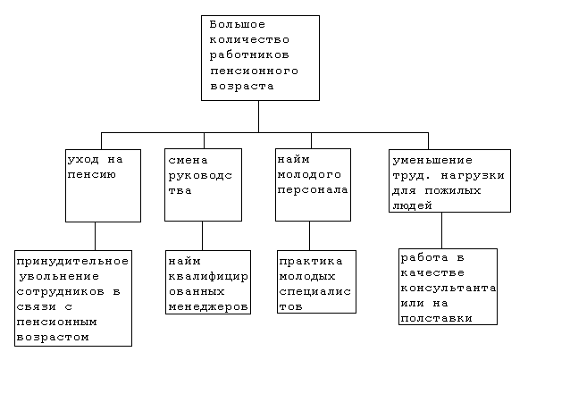 Проблема разрешима несколькими способами, которые так же могут использоваться в комплексе. Во-первых, это смена руководителей высшего звена, назначение на их должность более квалифицированных менеджеров. Во-вторых, нужно нанять молодых работников, которые в дальнейшем смогут заменить персонал, который уже достиг пенсионного возраста. А так же уволить работников по причине ухода на пенсию, тех кто уже достиг пенсионного возраста. Так же возможно оставить пожилых работников в качестве консультантов, или работающих на полставки. Далее нужно расширить самые перспективные отделы такие как: отдел маркетинга, бухгалтерия, финансовый отдел, отдел сбыта и продажи продукции. Так же не лишним было бы прописать все права и обязанности каждого рабочего, чтобы в дальнейшем можно было чётко выяснить, по чьей вине работа не была выполнена в срок, это бы дисциплинировало работников.