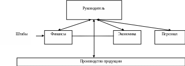 Схема основана на базовой схеме "звезда". Она предусматривает создание функциональных штабов при руководителе в форме отделов или групп (например, финансовый отдел, отдел кадров и т.д.). Эти штабы готовят руководителю проекты решений по соответствующим вопросам. Затем руководитель принимает решение и сам доводит его до соответствующего подразделения. Штабная схема имеет преимущество при необходимости осуществлять линейное управление (единоначалие) по ключевым подразделениям социальной организации.