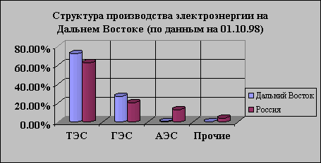 К концу 1998 г. суммарная установленная мощность электроэнергетической промышленности на Дальнем Востоке достигла 13,4 млн кВт. Электрическую энергию вырабатывают более 8800 установок, как общего пользования, так и ведомственных. При этом около 85% энергии вырабатывают электростанции общего пользования, принадлежащие крупным энергетическим компаниям, входящим в структуру РАО "ЕЭС России". Для региона характерно наличие большого количества маломощных дизельных установок, работающих в отдаленных и труднодоступных в транспортном отношении населенных пунктах.