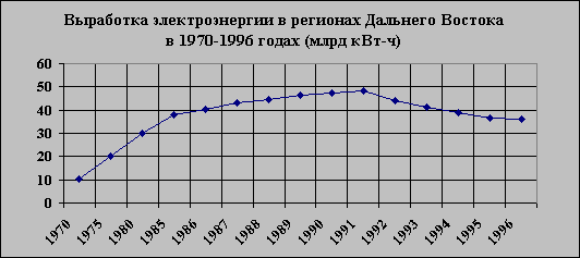 Максимальная в истории дальневосточной энергетики величина выработки электроэнергии была достигнута в 1991 г. - 48,1 млрд кВт-ч. Это в 4,6 раза больше по сравнению с 1970 г. Среднегодовые темпы прироста выработки электроэнергии за 1970-1991 гг. были выше, чем в среднем по России, и составили 7,5%. Столь высокая динамика в этот период связана с реализацией программ электрификации Транссибирской железнодорожной магистрали, а также ростом энергопотребления в промышленности и жилом секторе. После 1991 г. наблюдается постепенный спад в производстве электроэнергии, вызванный общим экономическим кризисом в стране. За период с 1991 по 1997 г. падение производства в электроэнергетике Дальнего Востока составило 21,3%, в то время как во всей промышленности более 50%. В целом годовые темпы спада здесь были выше, чем в среднем по России, что свидетельствует о более депрессивном состоянии экономики региона.[19,20]