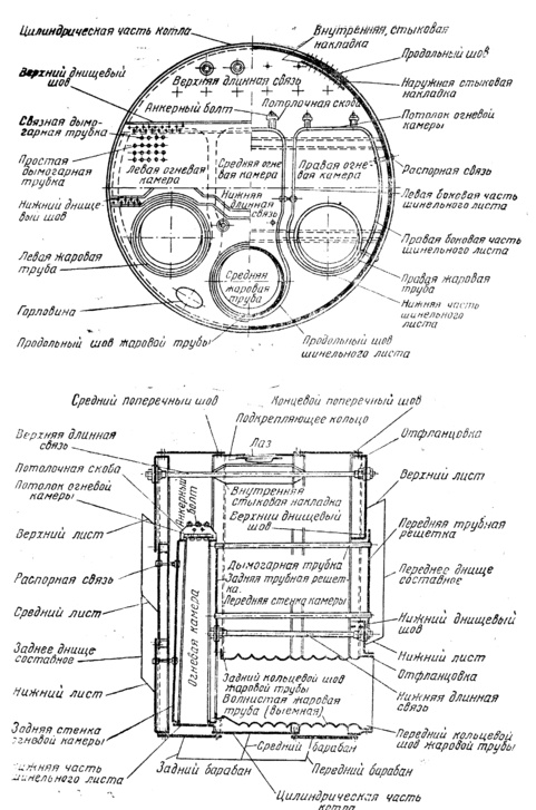 Внутри котла расположены три жаровые трубы, имеющие волнистые стенки. Передними прямыми концами жаровые трубы соединены при помощи заклепочных швов с отбуртованными фланцами переднего днища.