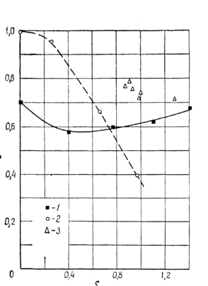 1. Закручивающее устройство с осевой и тангенциальной подачей наиболее эффективно при малых интенсивностях закрутки, но малоэффективно при больших интенсивностях закрутки. Например, при S=1 его эффективность ε=40%. Столь низкая эффективность связана главным образом с большой площадью внутренней поверхности внутренней трубы горелки, особенно вверх по потоку от отверстия тангенциальной подачи.