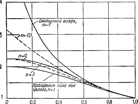 И от распределения окружной и осевой скоростей, которые могут не соответствовать вращению газа как целого. Значения ν для различных типов вихрей с ω = Сгn приведены на рис. 1.5. Можно видеть, что для любого заданного значения параметра закрутки вихрь при движении газа как целого (n=1) представляет собой случай минимума кинетической энергии, а свободный вихрь (n=-1) дает максимум кинетической энергии. Вихри с постоянной окружной скоростью (n=0) представляет собой промежуточный случай между вихрем с распределением скорости, соответствующим движению газа как целого, и свободным вихрем, и в случае, когда момент количества движения в значительной степени сконцентрирован во внешней части потока (n=3), получаются значения ν, лишь незначительно превышающие значения, соответствующие движению газа как целого.