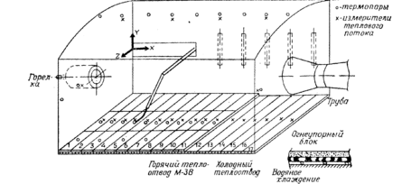 На рис.1.30 приведен эскиз экспериментальной топки Международной организации исследования горения (IFRF) с переменным отводом тепла, использованной для подробного экспериментального исследования гидродинамики и теплообмена. Топка имеет длину примерно 6,3 м и поперечное сечение 2Х2 м. Она состоит из 17 поперечных охлаждаемых водой секций. Горелка и труба расположены в центре торцевых поверхностей. Во время испытаний серии М-3 использовались две высокоскоростные туннельные горелки для природного газа, показанные на рис.1.31, в которых достигается полное сгорание на выходе из горелки. Продукты сгорания поступают в топку без закрутки и горизонтально или под углом 25° к горизонту. В предыдущих испытаниях в IFRF были исследованы пламени распыленной нефти и измельченного в порошок угля с закруткой.