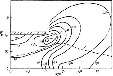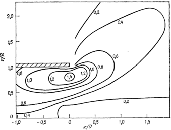 С точки зрения организации процесса горения одно из наиболее существенных и полезных явлений в закрученных струйных течениях — это образование приосевой рециркуляционной зоны при сверхкритических значениях параметра закрутки. Путем осреднения по большому интервалу времени границу рециркуляционной зоны и зон обратных токов можно определить довольно точно. Мгновенное же положение границ и точек торможения претерпевает значительные колебания в пространстве, поскольку обычно в таких потоках уровень турбулентных сдвиговых напряжений и интенсивности турбулентности очень высок. Линии тока в кольцевой закрученной свободной струе, определенные по измеренным распределениям осредненной по времени скорости. Рециркуляционная зона играет важную роль в стабилизации пламени, поскольку обеспечивает рециркуляцию горячих продуктов сгорания и сокращает размер области, в которой скорость потока сравнивается со скоростью распространения фронта пламени. Существенно укорачиваются длина факела и расстояние от горелки, на котором происходит стабилизация пламени.