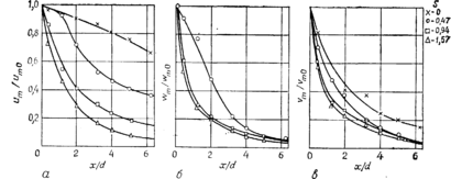 Изменение продольной составляющей 'скорости вдоль оси струи круглого сечения при различных значениях параметра закрутки показано на рис. 4.5 ; струя распространялась из закручивающего устройства с тангенциальным подводом. При малых интенсивностях закрутки (5<0,1) вблизи выхода наблюдается потенциальное ядро (т. е. область неизменной скорости). С увеличением параметра закрутки длина ядра уменьшается, и при S === 0,5 максимальное значение и смещается от оси. При 5 > 0,6 на оси появляется обратный поток. Специальный эксперимент, в котором параметр закрутки по возможности непрерывно изменялся в диапазоне 0,3 ... 0,64, показал,. что изменение распределения происходит монотонно, без скачков, не было обнаружено существенной разницы и при повторении опыта с изменением 5 в том же диапазоне, но в обратной последовательности, В соответствии с ростом темпа расширения струи возрастает скорость эжекции, вследствии чего ускоряется вырождение неравномерности скорости и концентрации жидкости, истекающей из сопла. Это положение иллюстрируют экспериментальные данные, представленные на рис. 4.6, где для различных значений параметра закрутки приведены распределения вдоль струи максимальных значений продольной (рис. 4.6, а), окружной (рис. 4.6,6) и радиальной (рис. 4.6, в) скоростей. При высокой интенсивности закрутки, когда начинает образовываться рециркуляционная зона и появляются области малых или отрицательных значений продольной составляющей скорости, ее максимум смещен от оси струи. Отметим, что вниз по потоку максимальные значения продольной и радиальной составляющих скорости, а также минимальное значение давления изменяются обратно пропорционально' приведенному расстоянию от среза сопла в степенях один, два и четыре соответственно.