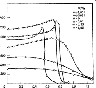Рис.4.43а.Радиальное распределение температуры в факеле вихревой горелки.