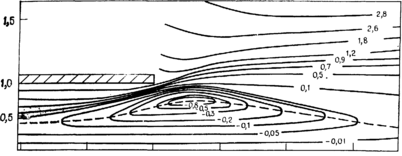 Рис. 4.7. Изолинии функции тока Штриховая линия соответствует нулевым значениям продольной скорости