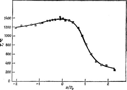 Рис. 4.436. Изменение максимальной температуры вдоль оси горелки.