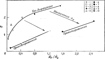 Тип закручивающего устройства (за исключением лопаточного завихрителя без втулки) и наличие соосных трубок для подвода топлива или форсунок, по-видимому, не влияют на характер связи. Для устройств с цилиндрической выходной частью представленные данные можно описать зависимостью