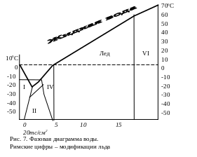 В первой четверти нашего века немецкий химик Г. Тамман и американский физик П. Бриджмен выявили шесть разновидностей льда, различающихся давлениями и температурами (рис. 7):
