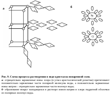 Процесс растворения твердых веществ в воде можно рассматривать как борьбу двух электростатических сил с противоположными зарядами, присущих ионам твердого вещества, с одной стороны, и ионам и молекулам воды — с другой. На рис. 9 показана схема процесса растворения кристалла поваренной соли (NaCI). Оторванные от кристалла заряженные ионы хлора и натрия окружаются молекулами воды и образуют вокруг иона твердого вещества гидратную оболочку. Иногда она сохраняется даже в том случае, когда твердое вещество выпадает из насыщенного раствора в осадок. Например, выпадающий из раствора при его пересыщении сульфат кальция (Са[S04]) захватывает воду (называемую кристаллизационной) и становится гипсом (Ca[S04] · 2H20). Процесс может идти и в обратную сторону. Аналогичное происходит и с гематитом (железным блеском Fe2Оз), переходящим при гидратации в лимонит (бурый железняк HFeO2 · nH2O, где п достигает 4) и т. п.