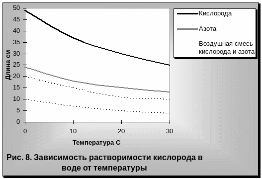 При повышении минерализации воды растворимость газа падает. Так, при 0°С растворимость кислорода в 1 л воды с минерализацией менее 1 г/л составляет 49 мл, а при минерализации 30 г/л*—только 15, т. е. в три раза меньше.