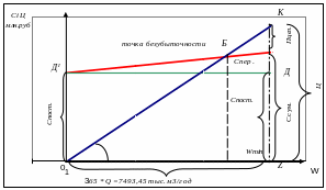 Точка безубыточности характеризует минимальный объем сточных вод, который должен поступить на очистные сооружения. опущенный перпендикуляр из точки безубыточности показывает минимальный объем сточных вод, необходимый для безубыточной работы сооружений водоотведения.