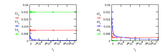 Характер изменения постоянных времени колебательных звеньев Т2, Т3, Т4 и коэффициента демпфирования в этих звеньях, представлен на графиках (Т3, d3 относятся к редуктору; T2, T4, d2, d4 - к креплению телекамеры):