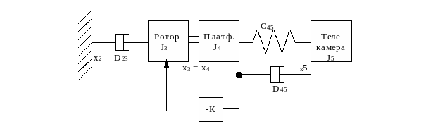 Для этого рассмотрим модель с “жестким” редуктором, т.е. полагая, что С34 бесконечно велико, и не учитывая нежесткость наружной рамы. Тогда базовая модель будет включать в себя только следующие элементы: