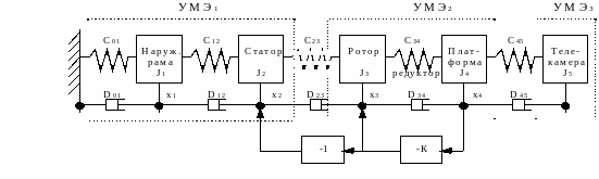 Выводы сделаные ранее возможно представить в более общем виде. Модель приведенную на Рис.1 можно обобщить, представив ее в виде нескольких упруго-массовых элементов, соединенных последовательно и охваченных цепью обратной связи. Вид такой модели приведен на Рис.3.