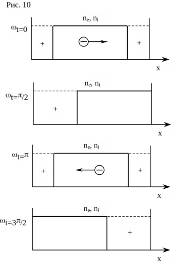 Допустим, что электроды оголены. Те электроны, которые в момент прохождения положения равновесия отстояли от электродов на расстояниях, меньших амплитуды колебаний, после первых же качаний “навсегда” уходят в металл. В состоянии равновесия с обеих сторон остаются слои нескомпенсированного ионного заряда, газ в целом оказывается заряженным положительно. При последующих качаниях электронный газ, если отвлечься от медленного диффузионного процесса, только касается электродов. На рис.10 схематично изображено качание электронного газа в предположении, что ионы совершенно н