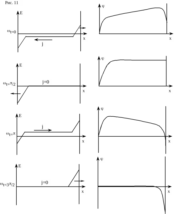 еподвижны и однородно распределены по длине промежутка, а диффузионное движение электронов отсутствует. На самом деле диффузия размывает границы между плазмой и ионными слоями. На рис. 11 построены соответствующие рис.10 распределения поля и потенциала в те же моменты времени через каждые четверть периода. Поле Е в однородной электронейтральной части промежутка постоянно по его длине. Потенциал для определённости отсчитывается от левого электрода. Можно себе представить, что он заземлён, а переменное напряжение подаётся на правый. Значение и направление электрического тока, можно считать, характеризуется напряженностью поля Е в плазме, так как чаще всего в самой плазме ток проводимости преобладает над током смещения.