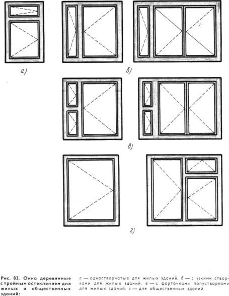 | Для жилых и общественных зданий, возводимых в I и II подзонах Северной строительно-климатической зоны, а также для районов с расчетной температурой наружного воздуха -40С и ниже (при соответствующем обосновании) применяют деревянные окна и балконные двери с тройным остеклением и тройным уплотнением притворов (ГОСТ 16289—70) (рис. 83). Для жилых зданий применяют окна одностворчатые с узкими створками высотой 863, 1163, 1463 мм и шириной 880, 1154, 1329, 1379, 1479, 2072 мм и окна с форточками – полустворками высотой 1163, 1463 мм и шириной 1154, 1329, 1379, 1479, 2072 и 2172 мм. |