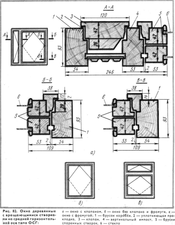 Оконные блоки деревянные со спаренными створками, вращающимися на средних осях, для гражданских зданий подразделяются на два типа: вращающиеся на средних горизонтальных осях — среднеподвесные ОСГ, имеющие дополнительно вентиляционные клапаны или верхние фрамуги, и окна со створками, вращающимися на средних вертикальных осях, —среднеповоротные ОСВ.