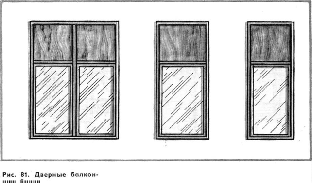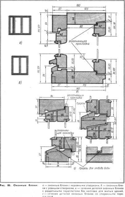 Оконные блоки с равными створками (рис 80,б) выпускают с форточками и без них. Оконные блоки со спаренными переплетами и дверные балконные блоки со спаренными полотнами делают с наплавом, а с раздельными переплетами и полотнами — с наплавом и без наплава (рис 80 в).