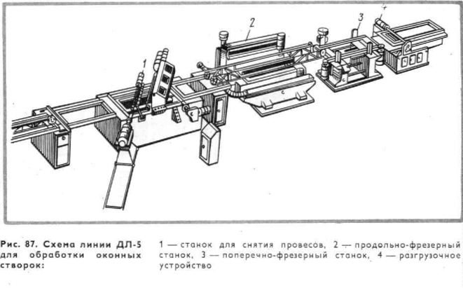 На линии ДЛ-5 (рис. 87) обрабатывают плоскости створок со снятием провесов и по периметру с созданием притвора (четверти). В состав линии входят: станок для снятия провесов, продольно-фрезерные станки и разгрузочное устройство.