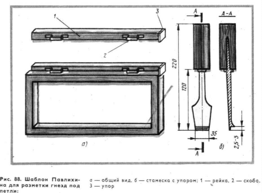 Трудоемкой операцией является навешивание створок с врезкой петель. На большинстве деревообрабатывающих предприятий эта операция механизирована. При отсутствии станков для врезки петель используют шаблон Павлихина (рис. 88), представляющий собой рейку 1 с упором 3 и двумя скобами 2 с заточенными фасками. Размеры скоб соответствуют размерам петель. При разметке шаблон кладут на кромку створки по упору, а затем легким ударом по скобе переносят ее отпечаток на створку и по нему в дальнейшем прорезают гнездо под петлю. Аналогичным образом делают разметку на коробках, а также дверных полотнах. По полученной разметке стамеской с упором прорезают гнезда под петли. Упор стамески позволяет заглубить лезвие лишь на заданный размер. Глубина гнезда под петлю должна точно соответствовать толщине ее, с тем чтобы после установки поверхность петли была заподлицо с древесиной.