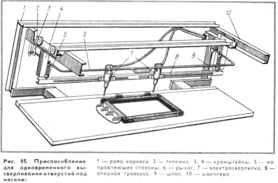 Отверстия под нагели выбирают электросверлилкой или коловоротом. На некоторых предприятиях отверстия под нагели выбирают сразу по двум или четырем углам специальным приспособлением (рис 85), состоящим из каркаса (рамы), устанавливаемого на станке по сборке окон. К стойкам каркаса крепят швеллеры 10, по которым передвигается тележка 2 с кронштейнами 3, 4, причем к кронштейнам 3 шарнирно прикреплен рычаг 6, с помощью которого тележка 2 может двигаться вперед и назад.