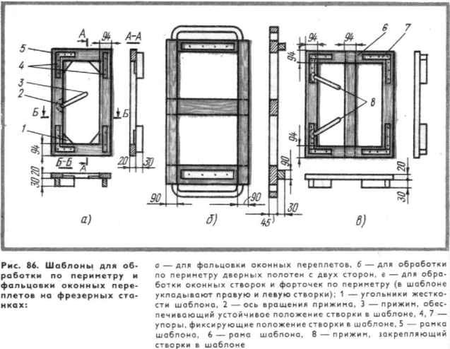 Створки, фрамуги и другие детали на небольших предприятиях по периметру обрабатывают на фрезерных станках с применением шаблонов (рис 86) На более крупных предприятиях створки, фрамуги обрабатывают на линиях.