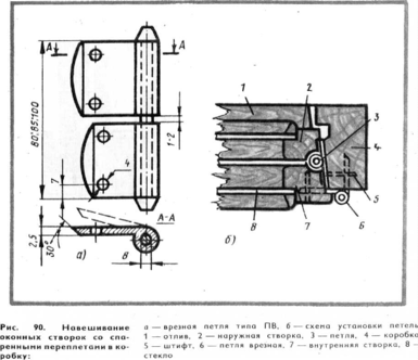 Сборку переплетов, коробок производят в сборочных станках. Собранную створку, укладывают на подстопное место для выдержки. После выдержки створки обрабатывают на линии ДЛ-5 или ДЛ-5А или на станках общего назначения. На трехцилиндровом шлифовальном станке или широком рейсмусовом станке зачищают и шлифуют наружные плоскости створок, после чего их укладывают в шаблон и на фрезерном станке обрабатывают по периметру. Затем в них выбирают гнезда под петли, причем во внутренних створках—под врезные петли, а во внутренней и наружной—под петли ПНО (рис. 90). Помимо этого во внутренней створке выбирают гнезда под замок завертки и отверстия под ручку завертки.