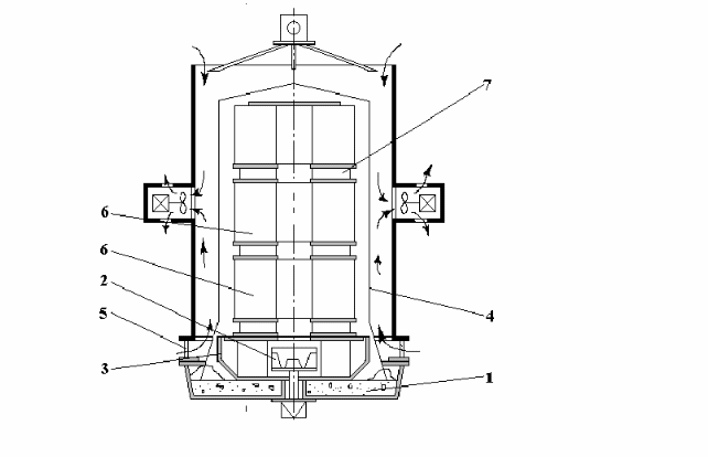 4 - песочный затвор; 5 - рабочее колесо; 6 - электродвигатель; 7 - опорное конвекторное колесо; остальные обозначения - в тексте