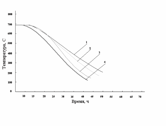 При охлаждении муфеля на воздухе время охлаждения под муфелем намного больше времени нагрева. Продолжительность охлаждения лимитирует цикл отжига и производительность печей тем в большей степени, чем ниже конечная температура охлаждения под муфелем. Допустимая температура распаковки стенда зависит от требований, предъявляемых к качеству поверхности отжигаемого металла. Для основной массовой продукции колпаковых печей - холоднокатаной малоуглеродистой рулонной стали и жести - эта температура на разных заводах колеблется в пределах 120-180 0С (по показаниям стационарной стендовой термопары), что соответствует примерно температуре внутренних по толщине намотки витков рулонов 150-220 0С.