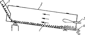 В связи с этим, по мнению автора, в ряде случаев целесообразно проводить сепарацию керамзитового гравия в воде. Предложенный сепаратор представляет собой ванну с водой, снабженную двумя скребковыми транспортерами, один из которых убирает со дна ванны тонущий керамзит, другой — всплывающий. Керамзит, подаваемый на сепарацию, находится в воде не более 5 с. Вода — подходящая среда для разделения керамзита по плотности зерен на два класса