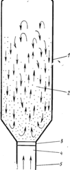 ипящий слой псевдоожиженного зернистого материала восходящими вверх газовыми потоками является не единственным его состоянием в этих условиях. Так, если в камеру 1 (рис. 1) на решетку 3 через патрубок 4 засыпать гранулированный материал, то он образует плотный слой с определенной межзерновой пустотно-стью. При подаче через этот слой восходящего потока газа с постепенно увеличивающейся скоростью материал сперва будет оставаться неподвижным, а сопротивление слоя будет расти с увеличением скорости газа. Когда же сила сопротивления фильтрации- газа сравняется с весом слоя зернистого материала, то дальнейший рост гидравлического сопротивления прекращается и увеличение скорости газового потока приводит к расширению слоя. При этом слой взвешивается, увеличивается в объеме, частицы приобретают подвижность. Поверхность слоя в этом случае выравнивается, и если в стенке камеры сделать отверстие 2, то через него будет вытекать струя материала. Это и послужило основанием назвать слой зернистого материала со свойствами текучести—псевдоожиженным. При дальнейшем увеличении скорости газа через псевдоожиженный слой будут прорываться пузырьки, слой начнет интенсивно перемешиваться и бурлить, напоминая кипящую жидкость, что послужило основанием назвать его в этом состоянии кипящим слоем. Характерным состоянием кипящего слоя является его относительная плотность, при которой зерна не отрываются в пространство для витания.