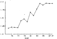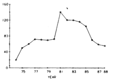 Эффективность работы на протяжении 15 лет показана на рис.9. Выход из строя валков достиг вершины в 1981 году в количество 130 валков в год, и впоследствии уменьшился значительно низкого уровня в 1986 году. Разрушения в результате потери прочности при смятии показаны на рис. 10. Разрушения постепенно достигали уровня 140 валков в год в 1981 году. Вместе с тем, выход валков из строя и разрушения в результате потери прочности при смятии содействовали около 270 перевалков валков в 1981 году. Общие количество выхода из строя валков намечалось уменьшить на 10% в 1988, учитывая 90-процентное уменьшение в 1981 году. С 1981 года разрушения в результате потери прочности удалось уменьшить на 57%.